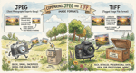- TIFF: Larger file sizes, optimal for enlarging. May not share easily across platforms.